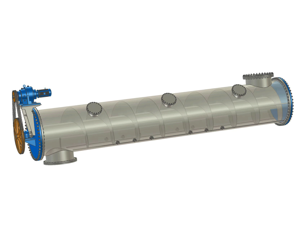螺旋式蒸煮管內(nèi)設(shè)有螺旋軸,當(dāng)螺旋軸旋轉(zhuǎn)時(shí),螺旋葉片推動(dòng)物料沿著管體軸向移動(dòng)。由于螺旋結(jié)構(gòu)的特性,物料在移動(dòng)過(guò)程中同時(shí)還會(huì)產(chǎn)生一定的翻轉(zhuǎn)和攪拌效果,使物料在輸送過(guò)程中能夠和內(nèi)部的蒸汽以及化工藥液均勻混合,保證了物料在蒸煮管內(nèi)均勻快速的加熱與反應(yīng)。